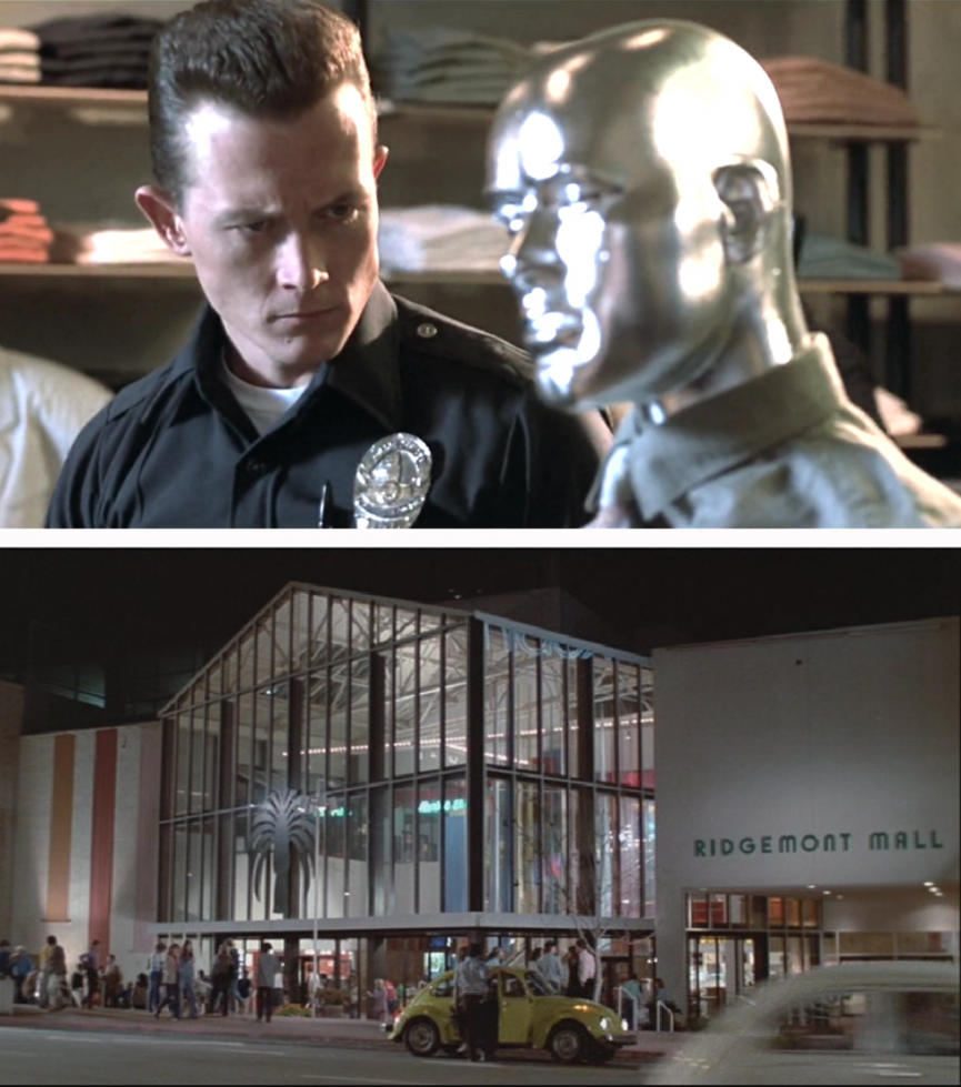 You know the shopping mall in which the two Terminators descend on John? That's Santa Monica Place, the exterior of which was used as Ridgemont Mall in Fast Times At Ridgemont High.