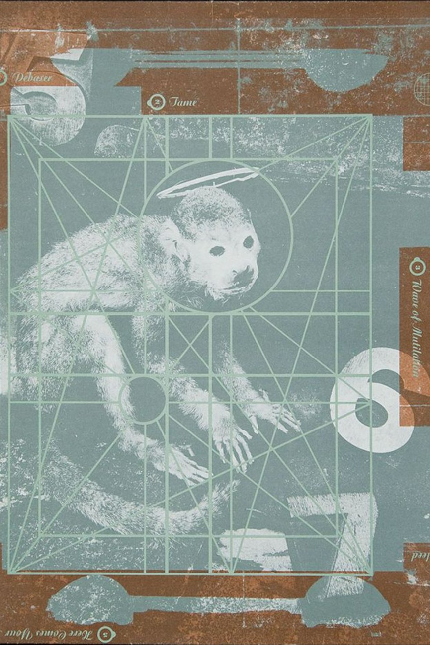 "5,6,7 Monkeys Gone to Heaven" was the refrain on the supporting single. Larbalestier shot the monkey. Who shot the Sheriff? I liked the challenge of using exactly the same photo from that sleeve and processing it to reflect the screenprint medium. Meanwhile, Black Francis broke my heart by telling me that successful pop music was simply the intellectual pursuit of good mathematics. Simple me thought it all came from the heart. Then I remembered that Golden Section theory used in the composition of Renaissance painting so I made my own grid to place over the monkey.
